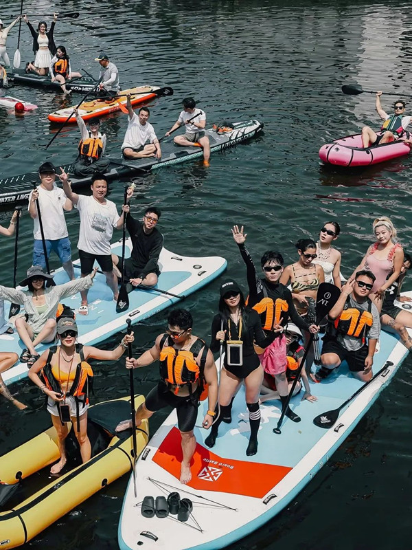 Tourists enjoy paddleboarding in WEDZ during the May Day holiday. [Photo/WeChat account: whkfq]